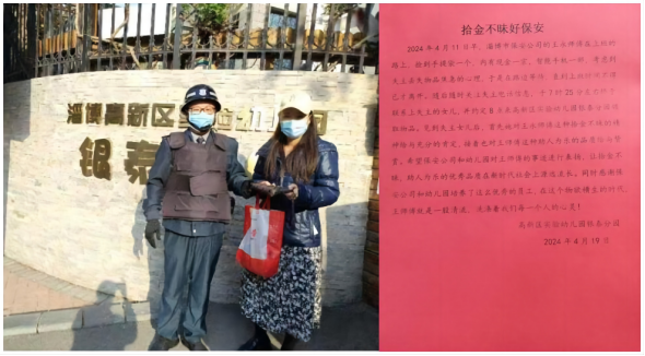 4月11日,市保安公司高新區(qū)銀泰城幼兒園項(xiàng)目部保安隊(duì)員王永上班路上撿到手提袋一個,四處找尋無果后,打開查看包內(nèi)有手機(jī)和少量現(xiàn)金,通過電話聯(lián)系找到失主,最終歸還遺失物品。失主家人拿到失而復(fù)得的財物后,十分激動并專門送上感謝信對其表示感謝。